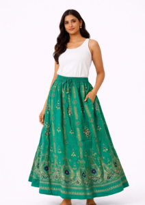 Teal Green & White Printed Cotton Maxi Skirt for Women
