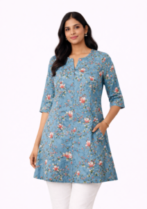 Sky Blue & White Printed Cotton Short Kurti