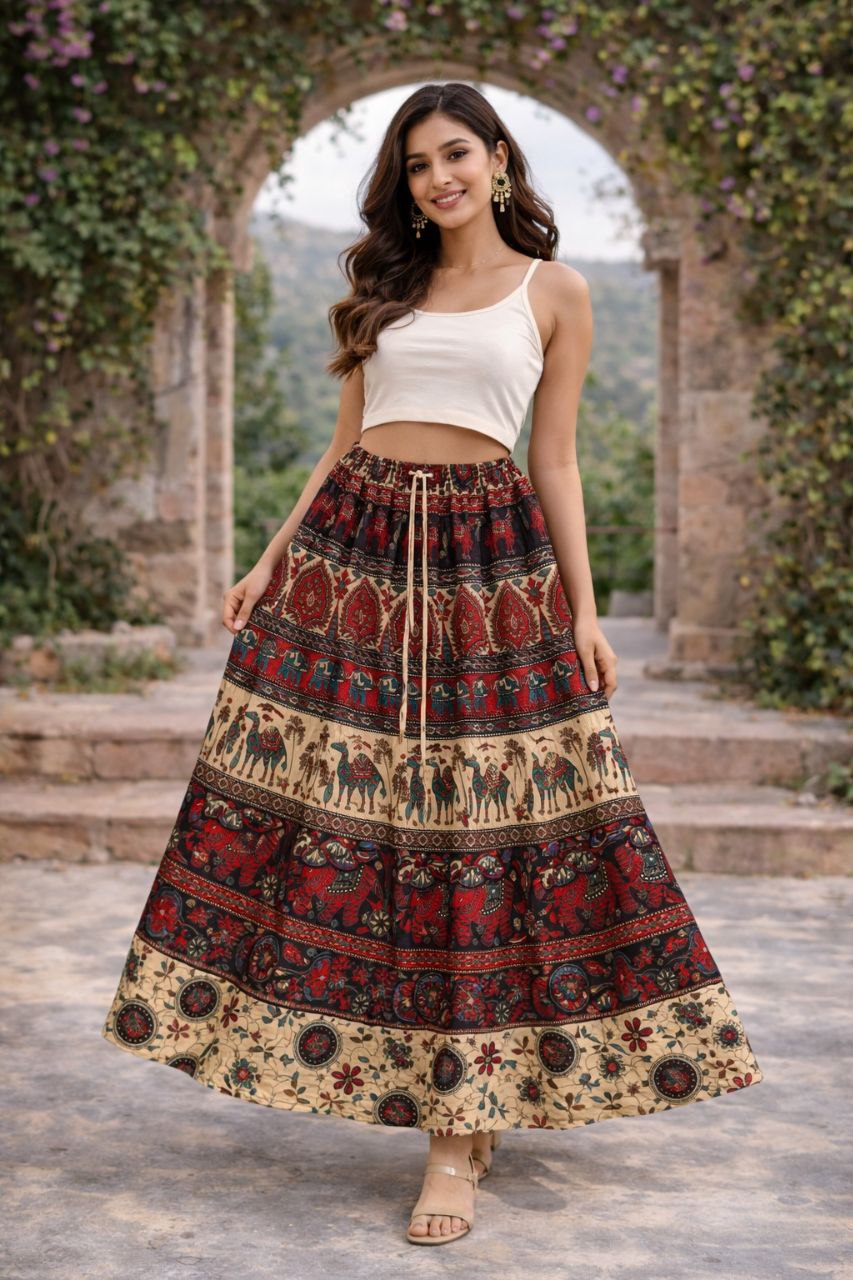 Designed with a free-size elastic waist and adjustable drawstring, it gives a flexible fit and a flattering flared look. The rich ethnic print and flowy silhouette make it a perfect choice for casual days, travel, college, and festive occasions.